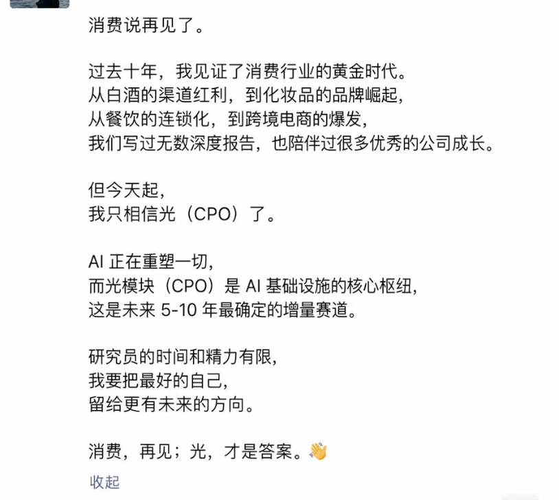 更值得注意的是,继医药研究员开始转向光模块的研究,又有疑似消费研究员也开始要“站在光里”的小作文传出,赛道实在太热了。